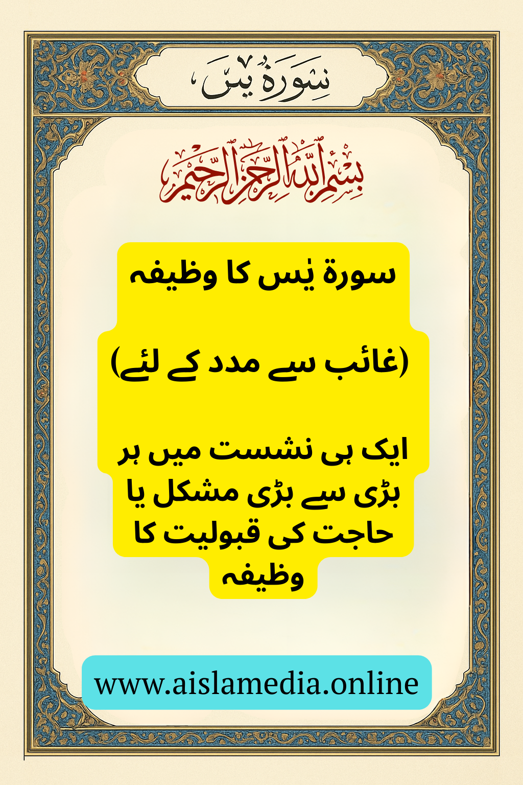 Insight • January 29, 2026 سورۃ یٰس کا وظیفہ: ایک ہی نشست میں ہر بڑی مشکل یا حاجت کی قبولیت ایک ہی نشست میں سورۃ یٰس کا مجرب وظیفہ جو ہر بڑی سے بڑی مشکل یا حاجت کی قبولیت کے لیے کیا جاتا ہے۔ وضو، نیت، عمل اور اثرات کے ساتھ مکمل رہنمائی۔ Syed